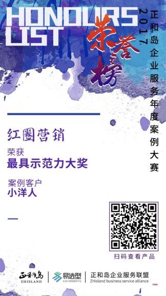 其中的正和島企業(yè)服務(wù)案例大賽評選,紅圈營銷憑借成功服務(wù)于中國馳名品牌小洋人的案例,獲得了“最具示范力”大獎,紅圈CRM同時成功入選億+計劃二期,彰顯了紅圈營銷在企業(yè)服務(wù)領(lǐng)域的超凡實力。