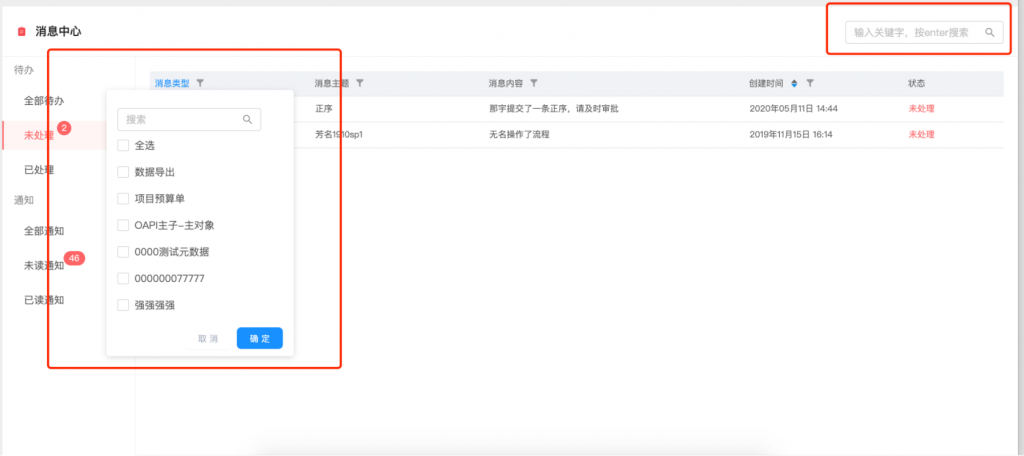 - 消息通知的類型和主題進(jìn)行了規(guī)范,便于進(jìn)行分類和篩選;每條消息可明確看到業(yè)務(wù)來源,主題更加清晰,大幅度減少了以“通知”為標(biāo)題的消息;同時(shí)查看或處理變?yōu)檎锌牲c(diǎn)擊;消息支持篩選和搜索,也可以直接搜索內(nèi)容或主題;待辦和通知的狀態(tài)變化更加智能,去除了手動(dòng)按鈕操作,當(dāng)處理或查看詳情后,狀態(tài)會(huì)自動(dòng)變化;同時(shí)優(yōu)化了紅點(diǎn)顯示數(shù)量的刷新機(jī)制,更新更及時(shí).