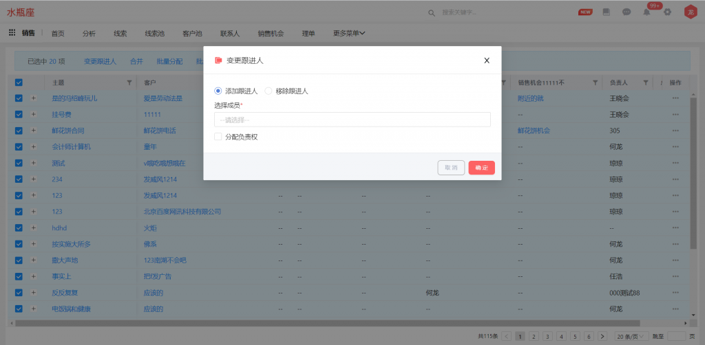 業(yè)務(wù)對象支持批量增加和刪除跟進人,同時增加“跟進人”字段,與跟進人組件同步,并支持篩選;使用前請先在對象管理中,將“跟進人”字段及“變更跟進人”按鈕的權(quán)限進行勾選
