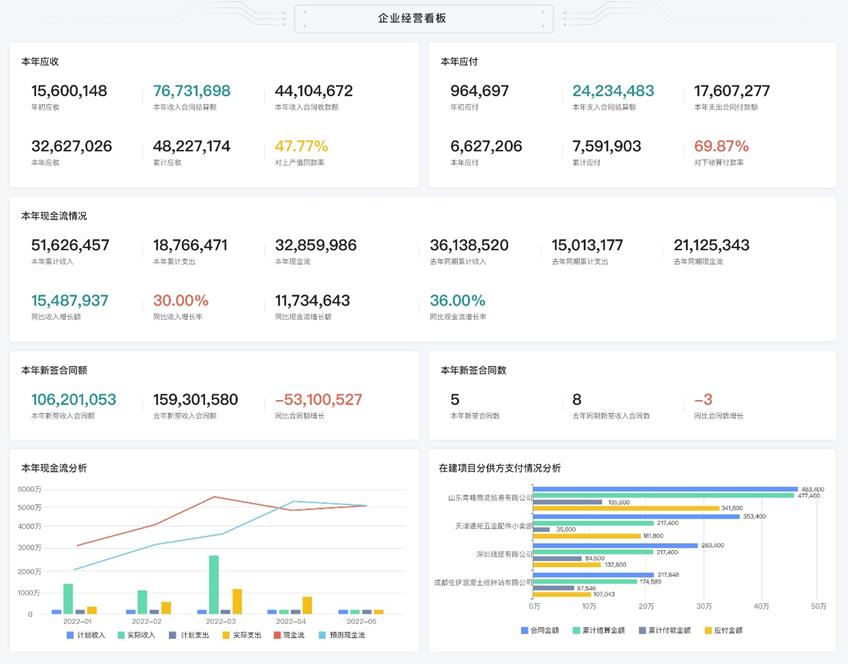 在數(shù)字換轉(zhuǎn)型的政策推動下,傳統(tǒng)工程企業(yè)也開啟了數(shù)字化轉(zhuǎn)型的發(fā)展新進程。在轉(zhuǎn)型初期,引進數(shù)字化管理工具能夠起到快速梳理和規(guī)范內(nèi)部管理的作用,再配合平臺大數(shù)據(jù)的信息互通,老板通過一個軟件就能夠隨時掌控企業(yè)現(xiàn)金流盈虧數(shù)據(jù),從而保證了企業(yè)現(xiàn)金流的良性周轉(zhuǎn)。