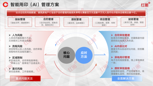 在企業的運營脈絡中,印章雖小,卻承載著沉重的法律責任與經濟風險。面對合同協議繁多、應用場景復雜的業務環境,特別是對于建筑工程類企業而言,依賴人工管理的傳統用印模式已顯疲態,在風險控制與運營效率方面捉襟見肘。基于對建筑行業數字化進程的深刻洞察,紅圈軟件推出了「智能AI印控一體化解決方案」,旨在以科技創新驅動管理變革,引領企業實現用印流程全面、徹底的數字化與智能化轉型。