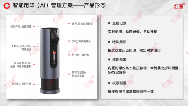 為解決上述痛點,紅圈構建了“AI智能核驗、全流程數字化、智能硬件保障、全場景覆蓋”四位一體的全方位用印風控體系。